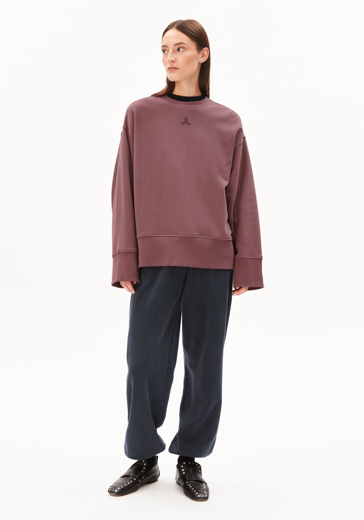 Sweatshirtul ANWAA este confecționat din bumbac 100% organic, are o croială amplă și confortabilă. Umerii căzuți și manșetele late evidențiază drapajul relaxat, iar broderia subtilă cu logo completează aspectul elegant.