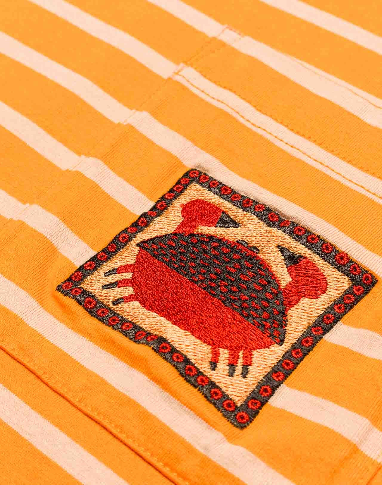 Tricou cu croială lejeră, ilustrată de artistul Jasper Van Gestel, cu guler rotund bleumarin, buzunar la piept și cusături laterale pentru ușurință în mișcare. Pe buzunar este brodat un crab. Țesătura este mid-weight, de 200gsm.